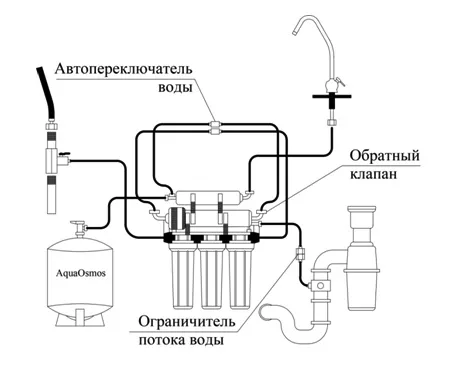 Система подключается в водопровод холодной воды (обычно под мойкой) с помощью тройника-адаптера и шарового крана. На мойке либо на столешнице монтируется кран для чистой воды. В слив канализации необходимо установить дренажный хомут.