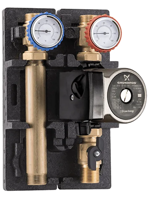 - два моноблока с фитингами на подающей и обратной линии. Состоящие из отсекающего шарового клапана, термометра до 120°C, обратного клапана;