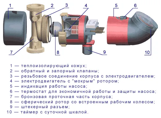 Насосы циркуляционные системы горячего водоснабжения оснащаются «мокрым» ротором сферической формы и однофазным электродвигателем с постоянным магнитом.